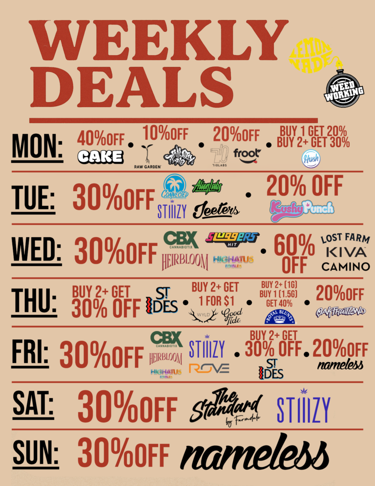 Weekly Deals! Weekly Cannabis Deals at Lemonnade Van Nuys Looking for the best weed deals in Van Nuys? Check out our rotating weekly specials featuring top cannabis brands, flower, vapes, edibles, concentrates, Shop Now ⭢